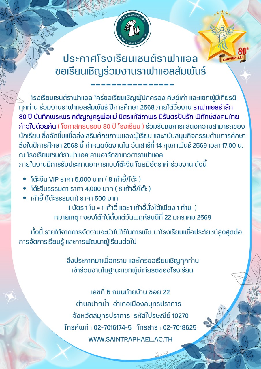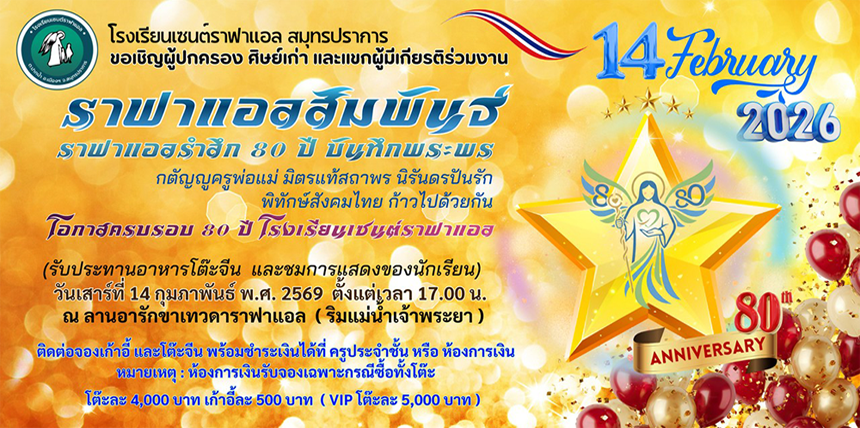 เสาร์ที่ 14 กุมภาพันธ์ 2569  - งานราฟาแอลสัมพันธ์ โอกาส 80 ปีโรงเรียนเซนต์ราฟาแอล
